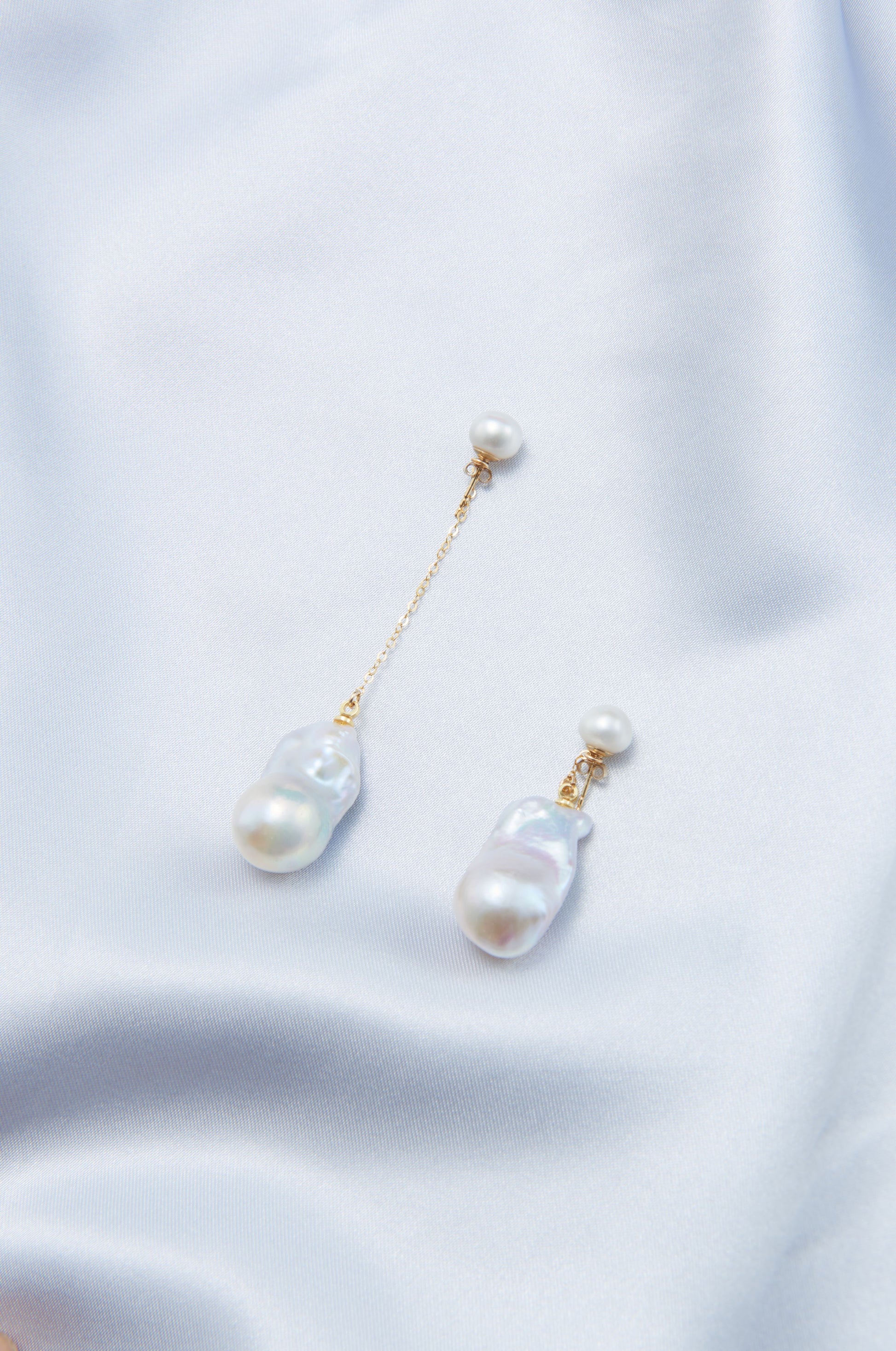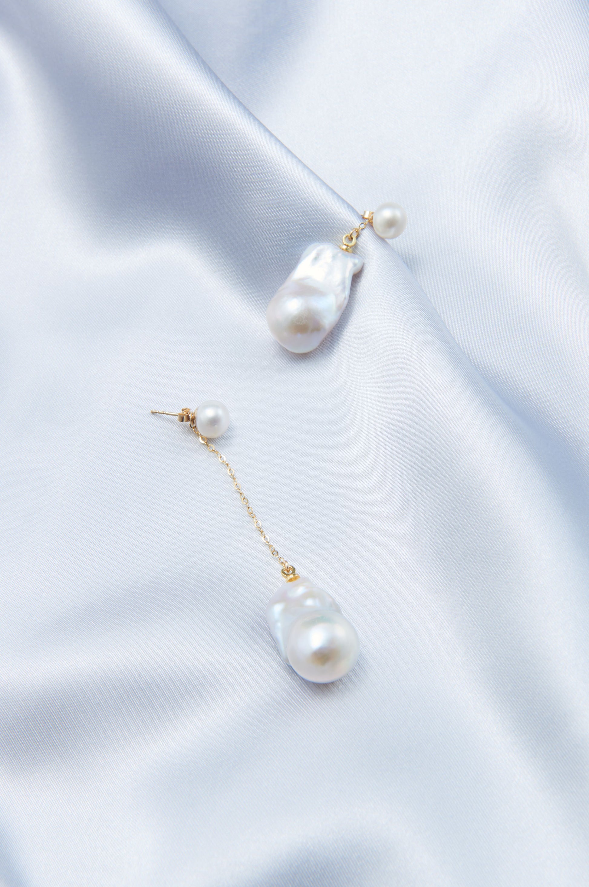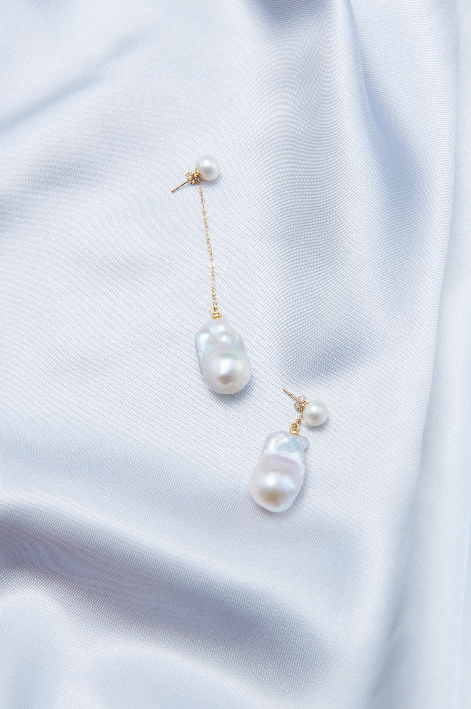 A poetic balance of elegance and individuality. These asymmetrical earrings feature luminous baroque pearls — one nestled close to the ear, the other gently suspended on a fine gold-filled chain. No two pearls are alike, and that’s where their quiet magic lies.