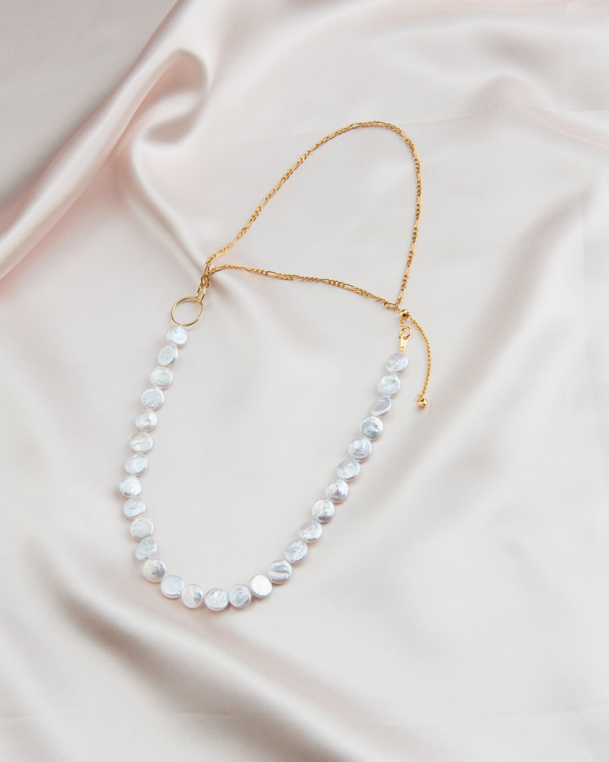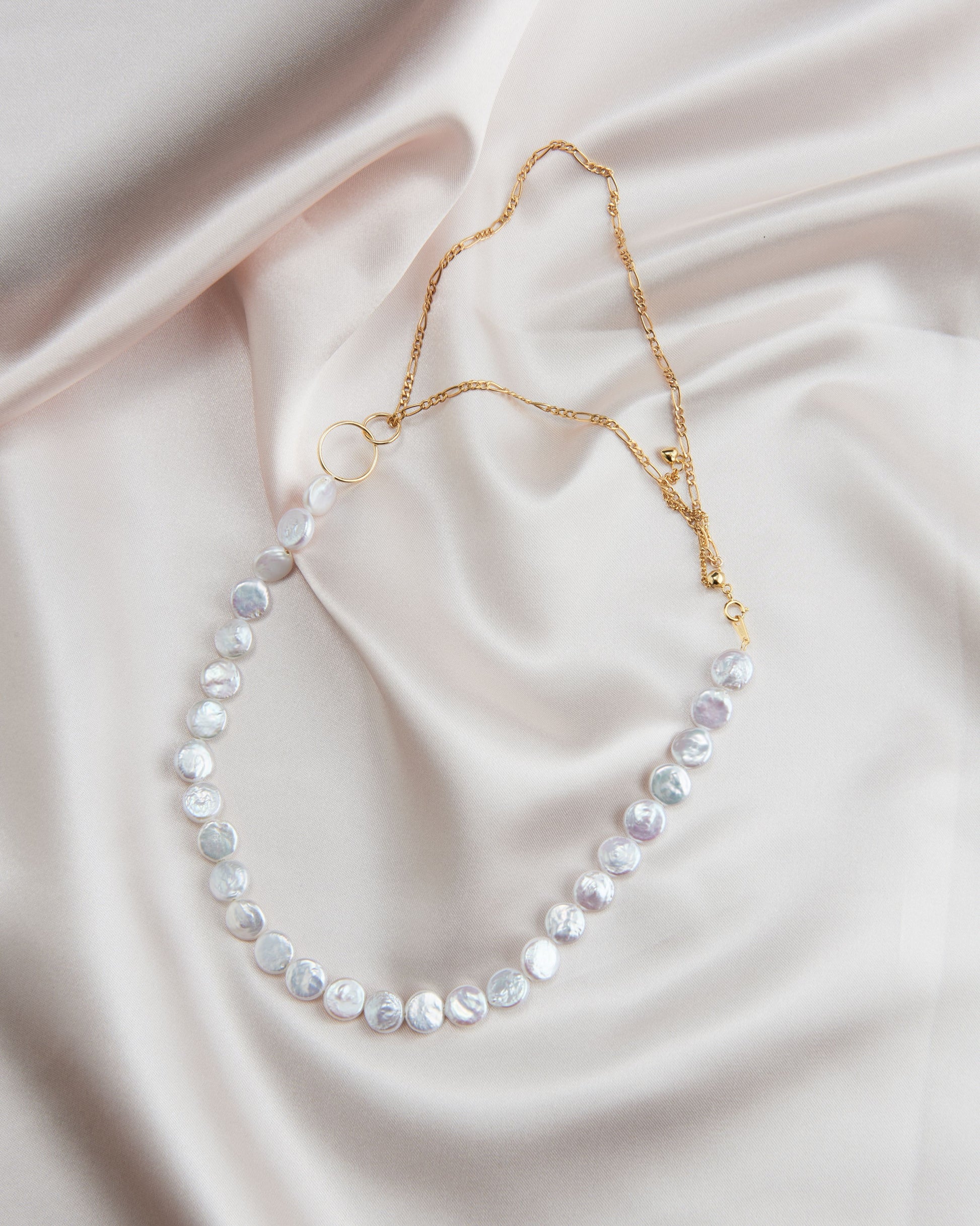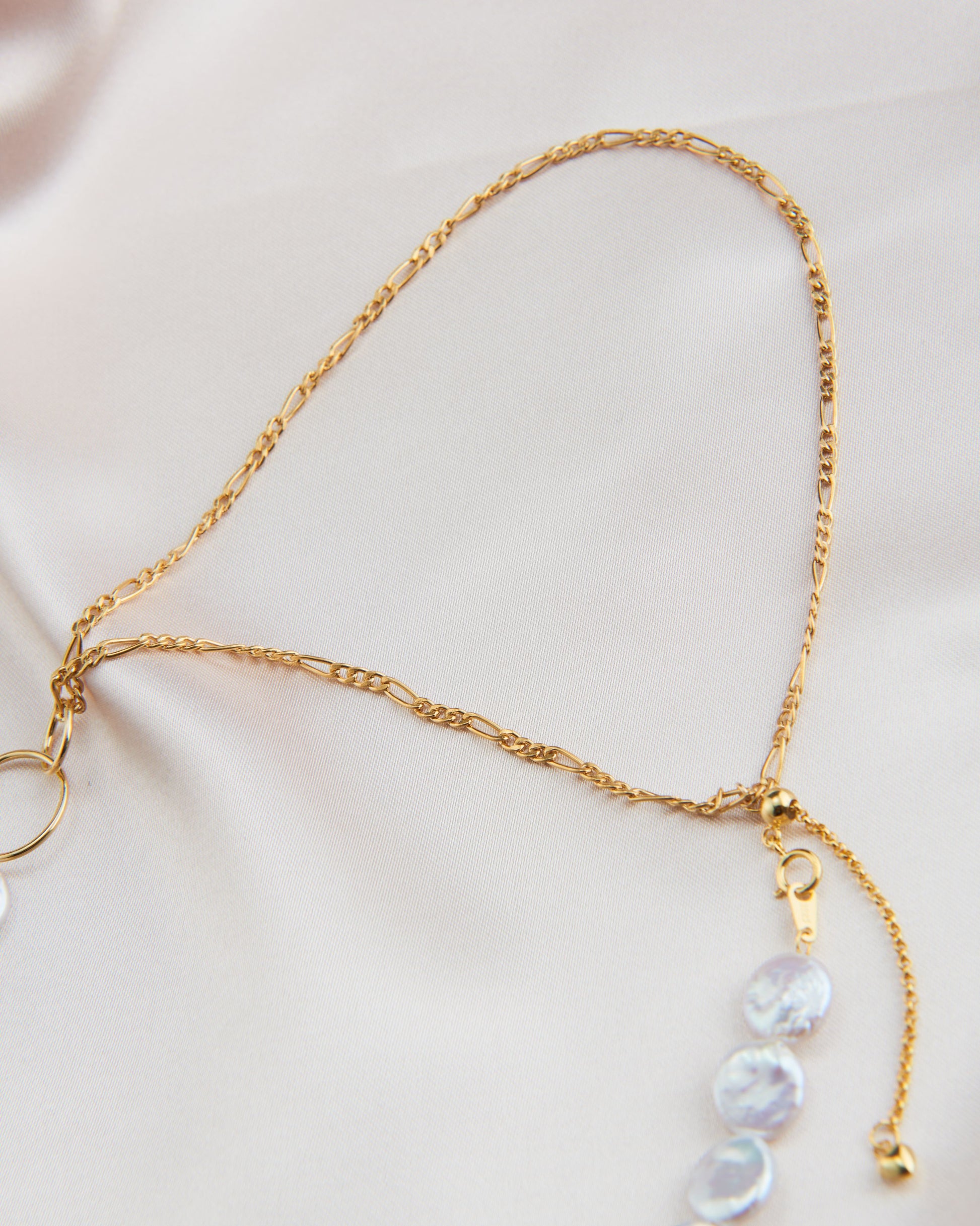 This elegant necklace features a delicate double-circle design paired with a baroque pearl centerpiece. The combination of 14K gold-filled chain and 18K gold-plated sterling silver elements offers both durability and a luxurious finish. A modern classic with a touch of organic beauty — perfect for layering or wearing solo.