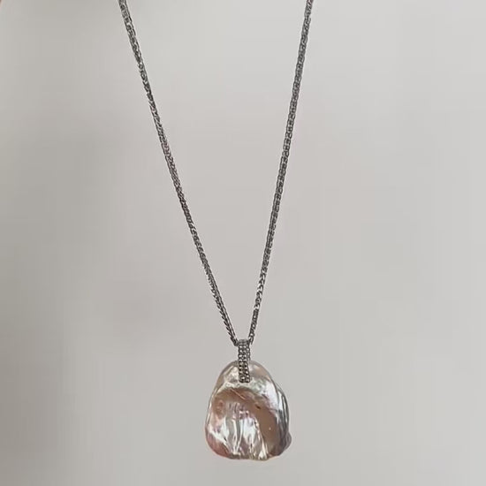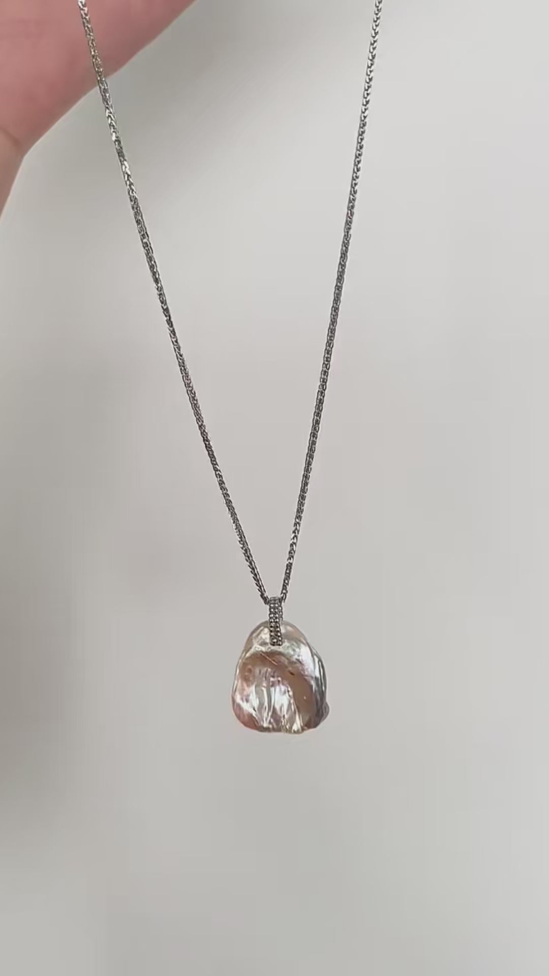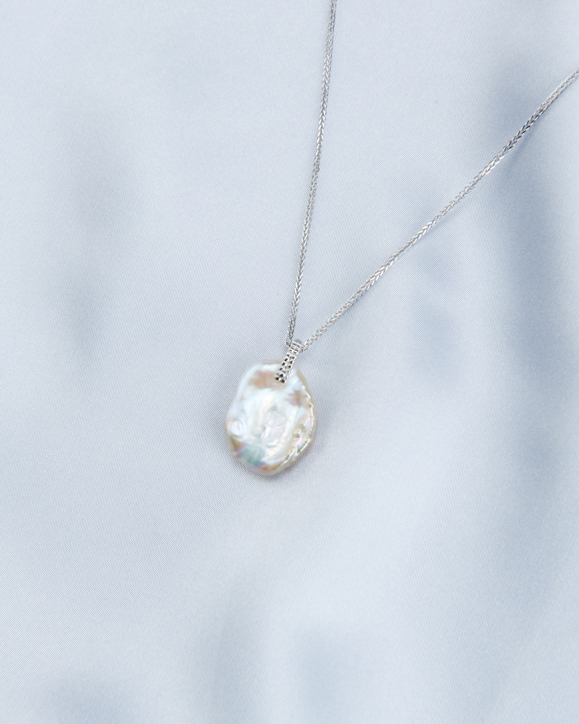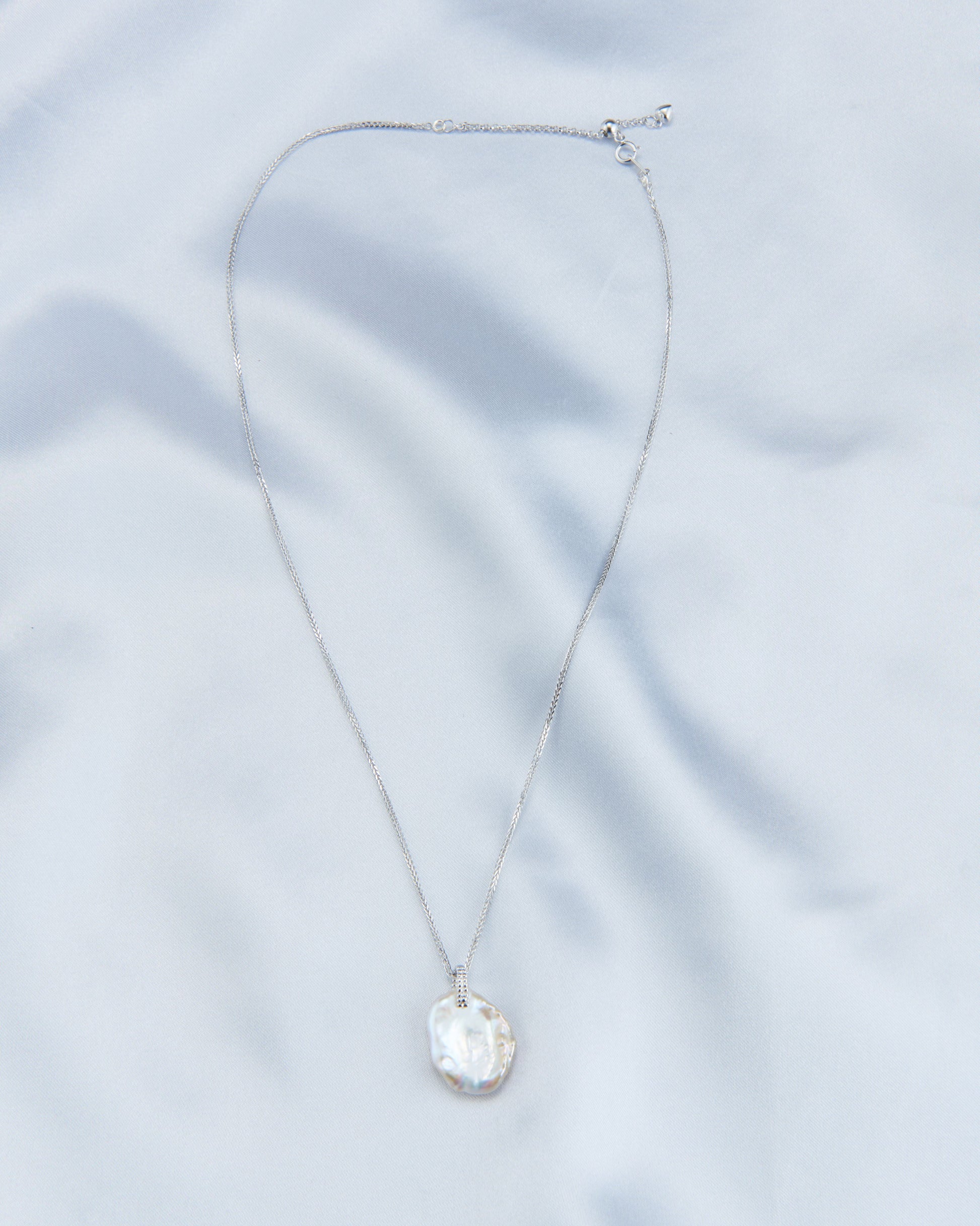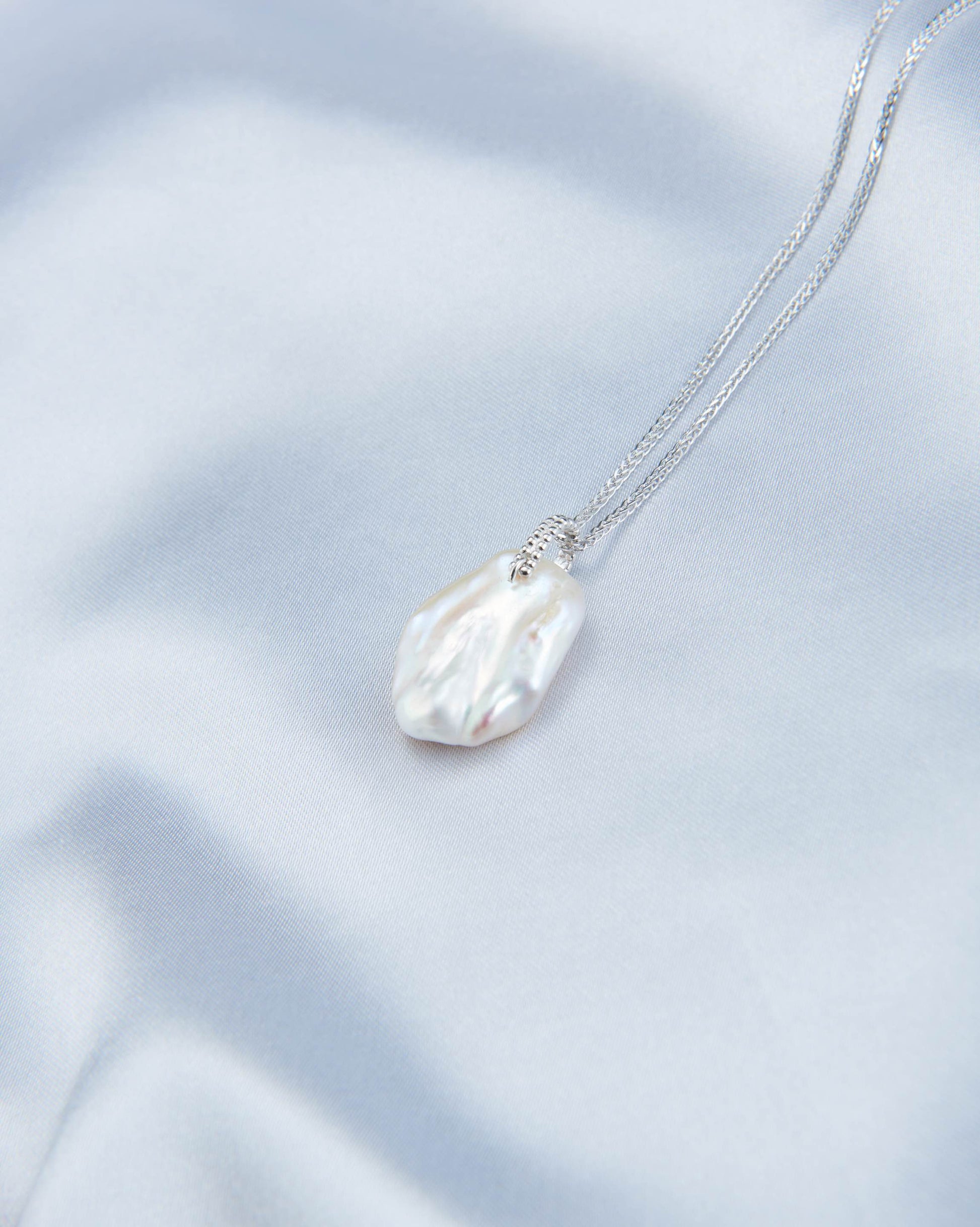 Crafted from solid sterling silver, this elegant necklace features a petal-shaped natural baroque pearl — each with its own unique organic form. A refined blend of nature-inspired design and timeless sophistication.